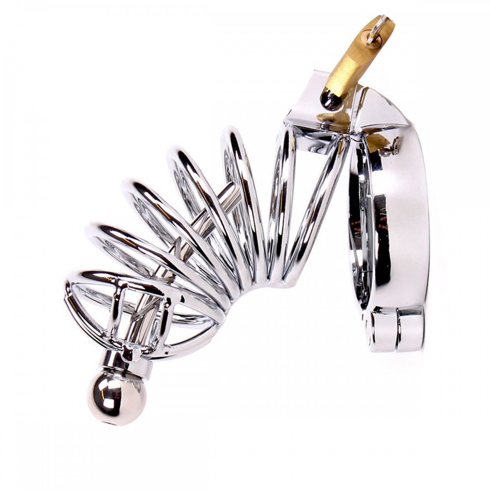 Tillverkad av rostfritt stål och består av två delar. En pungringoch en penisbur. De två delar samlas med det medföljande hänglåset. När du öppnar hänglåset kommer ringen att frigöra sig från penisdelen och sedan kan du ta av hela kyskhetsbur.