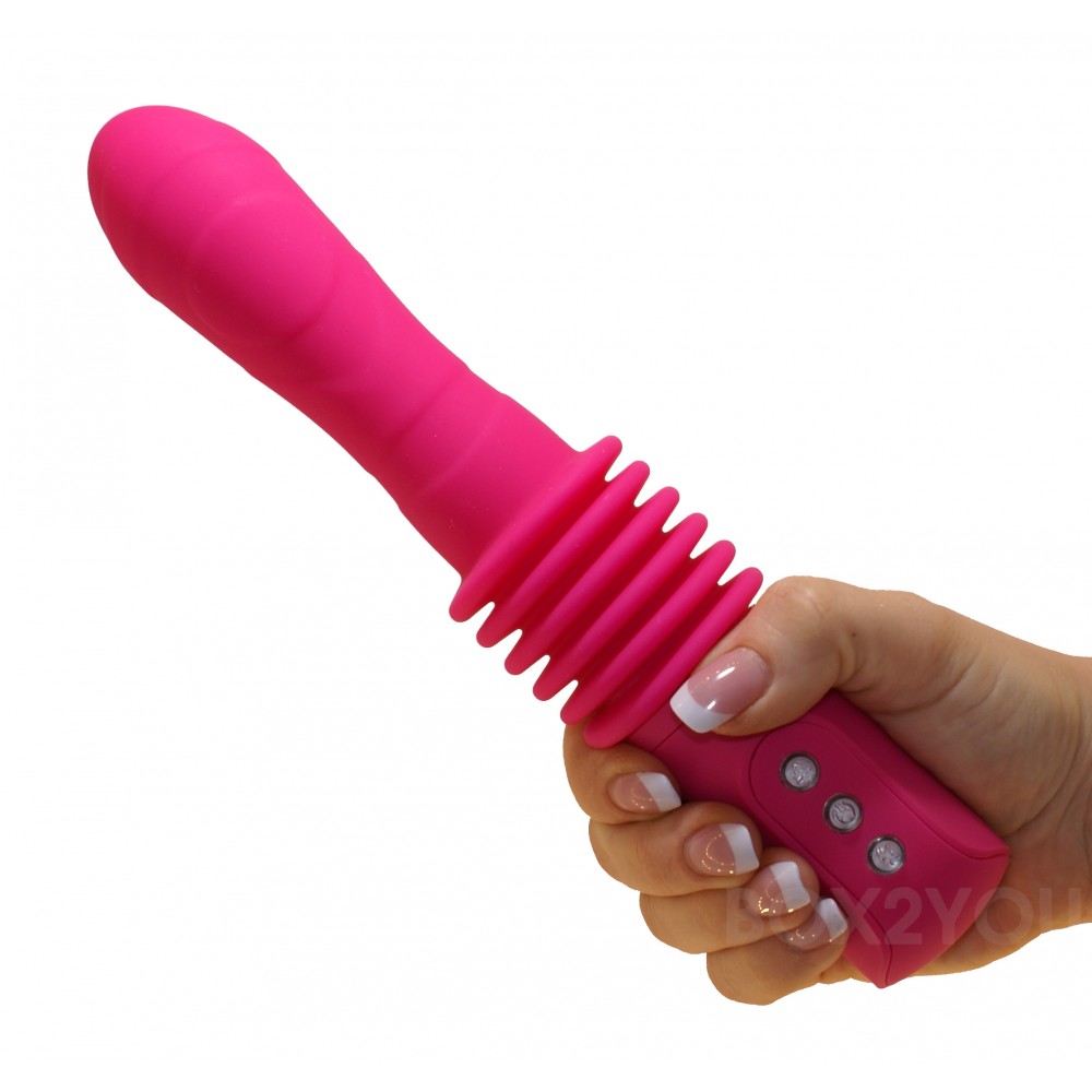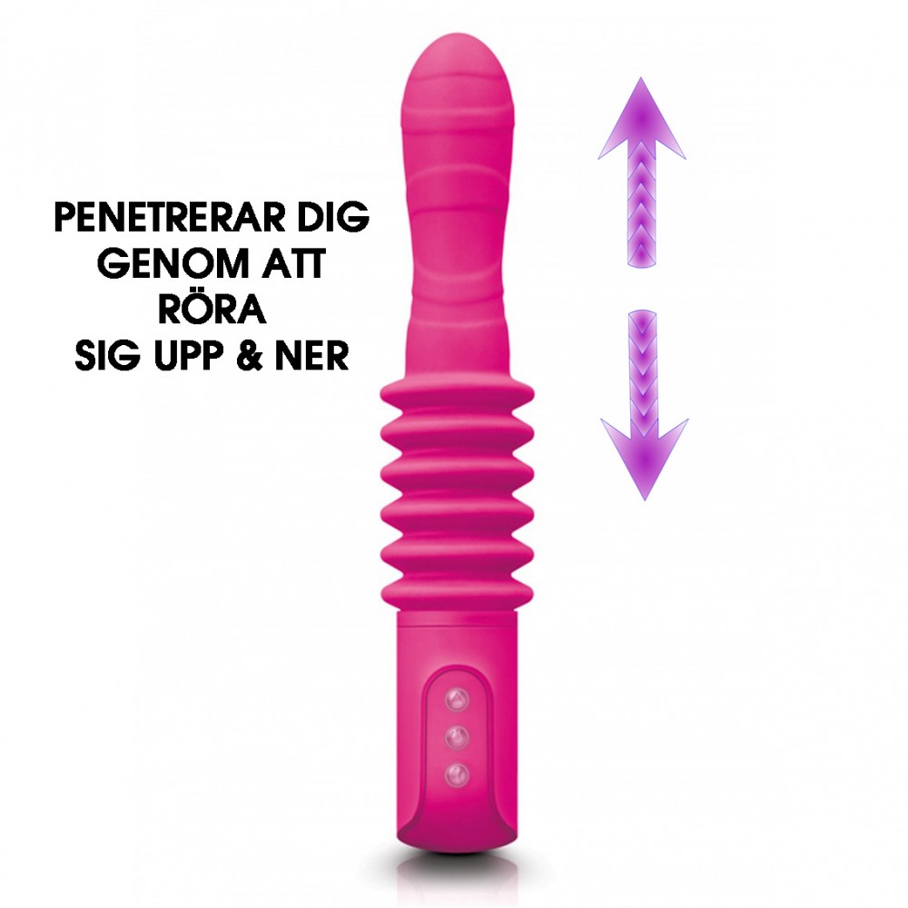 Välj mellan hela 10 olika varierande och kraftfulla program för att reta fram din orgasm - från olika hastigheter till rena vibrationsprogram. När du så småningom börjar närma dig orgasm.. då trycker du på nästa knapp som får staven att börja röra sig in och ut inuti dig! Du har orgasmen som ett brev på posten. Rörelsen upp och ner går att variera i 3 olika valbara hastigheter med enkla knapptryck. Den penetrerande rörelsen gör att skaftet förlängs med ca 5 cm och simulerar penetrerande sex.