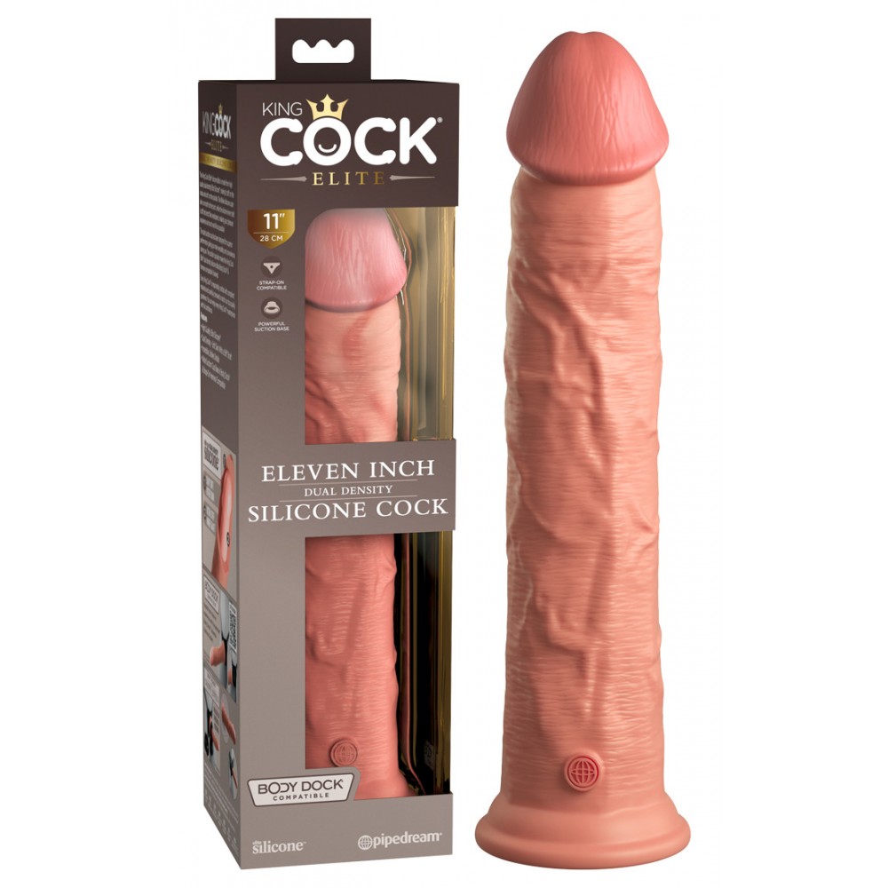 King Cock Elite 11" är tillverkad i dual-density silikon: en mjuk, hudlik ytteryta över en stabil, fast kärna. Resultatet är en verklighetstrogen respons med vacker ådring och tydlig topp. Den kraftiga sugfoten håller säkert på släta ytor och gör den kompatibel med strap-on-sele när du vill variera positioner.