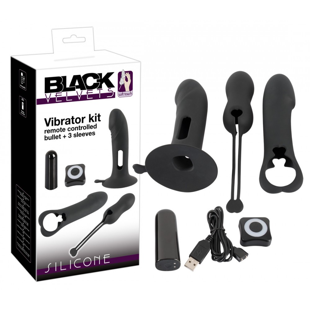Här har vi ett set för härlig njutning. Detta är en bullet-vibrator med 7 vibrationslägen och en fjärrkontroll med One Touch-knapp. Använd vibratorn inuti eller mot klitoris och du kan helt trådlöst styra dig till klimax. Denna bullet-vibrator kan kombineras med 3 olika tillbehör/sleeves. Välj mellan en penisformad hylsa med räfflor och ollon samt sugfot för härlig handsfree njutning, knipkulor med rem och eller ytterligare en penisformad hylsa med dragband och antydet ollon.