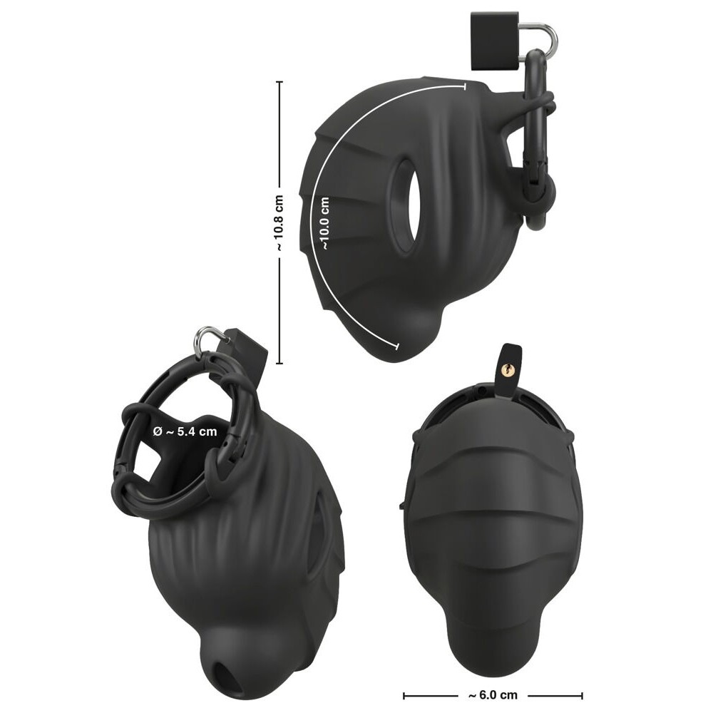 Den här buren är designad för både njutning och funktion – med en öppning längst ner för bekväm urinering och möjligheten att låsa den för total kontroll. Setet inkluderar ett lås med nyckel samt tre engångslås, vilket gör det enkelt att växla mellan lekfullt och seriöst beroende på humör.