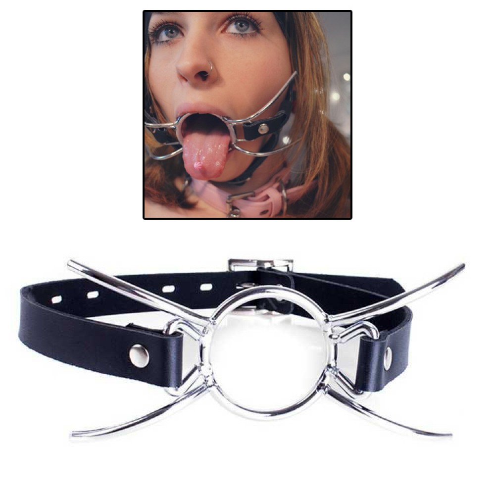Taggar: ringgag, gag, stål, BDSM, bondage, munfixering, öppen mun, metallben, rem med spänne, rollspel, steel spider gag