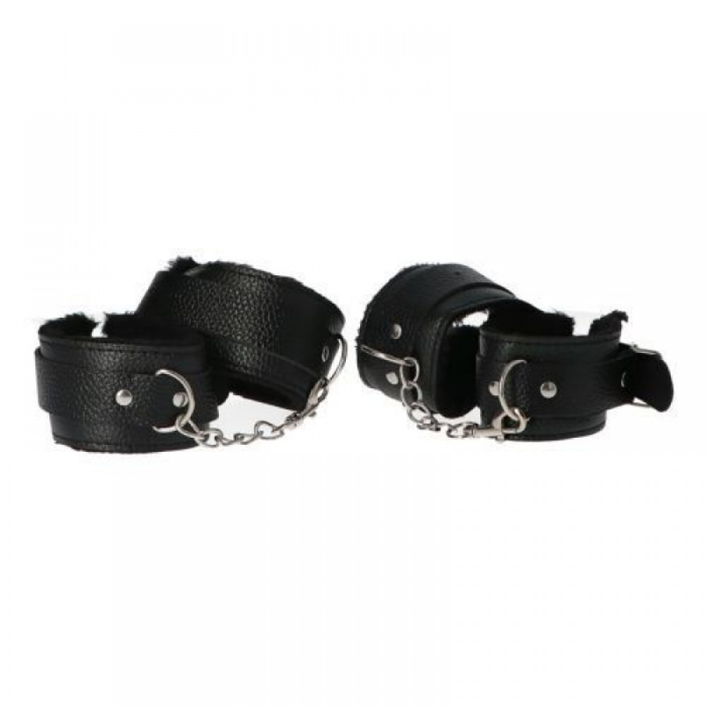 - Två handbojor med mjuk och lurvig insida och justerbara spännen. D-ring på utsidan för att fästas tillsammans eller i sänggavlar eller liknande.