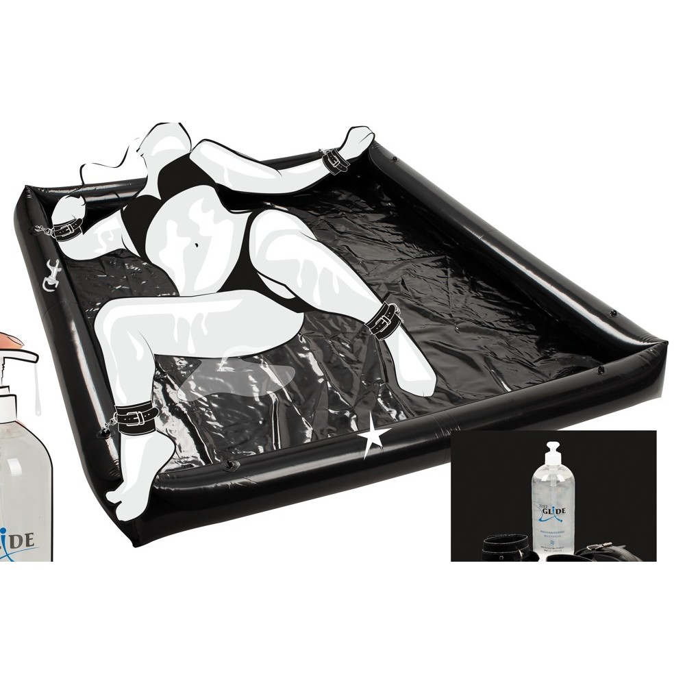 Som grädde på moset ingår 4 hand- och fotbojor för extra spännande lekar. Mattan har öglor i alla fyra hörn och bojorna fästs smidigt med karbinhakar – snabbt, enkelt och stabilt. Och ja: 1 liter glidmedel följer också med.