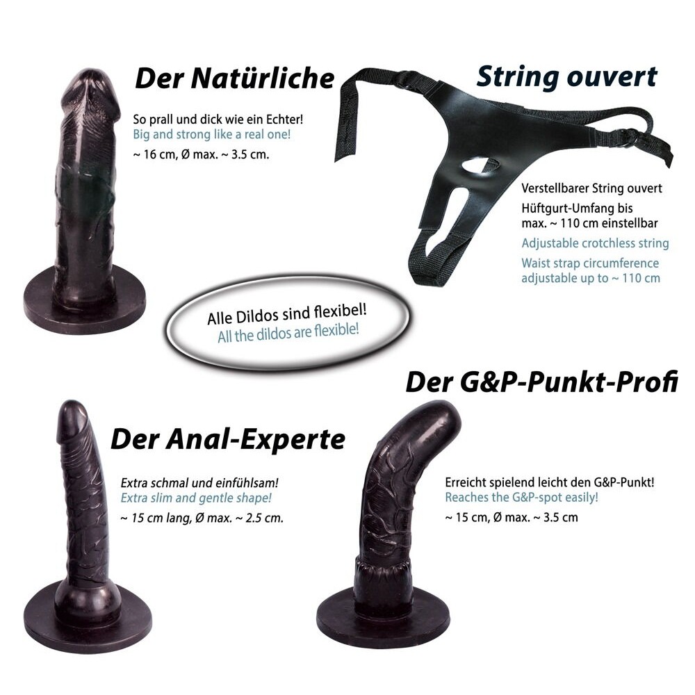 Utforska oändliga fantasier med detta Strap-On-set med tre utbytbara dildos!
