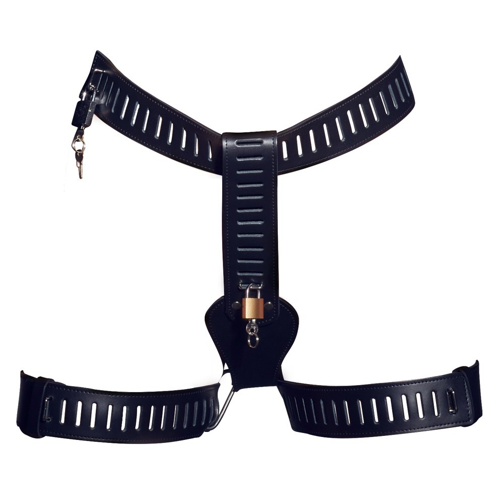 Denna stringtrosa är tillverkad i äkta läder och designad för att säkra total kontroll. Med stålöglor och fem medföljande hänglås kan du låsa in hennes mest intima område och garanterat hålla njutningen i schack – både på egen hand och tillsammans med andra.